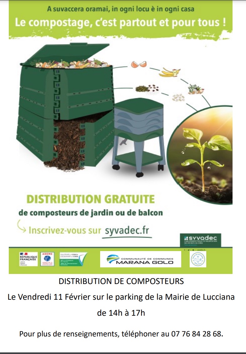 Une distribution de composteurs se déroulera le vendredi 11 février 2022, de 14h à 17h, sur le parking de la Mairie.