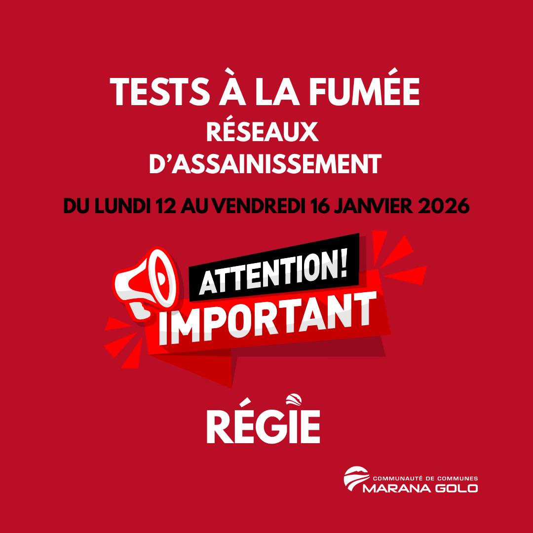 Dans le cadre du diagnostic des réseaux d’assainissement collectif, la Communauté de communes Marana Golo réalisera des tests à la fumée du lundi 12 au vendredi 16 janvier 2026.